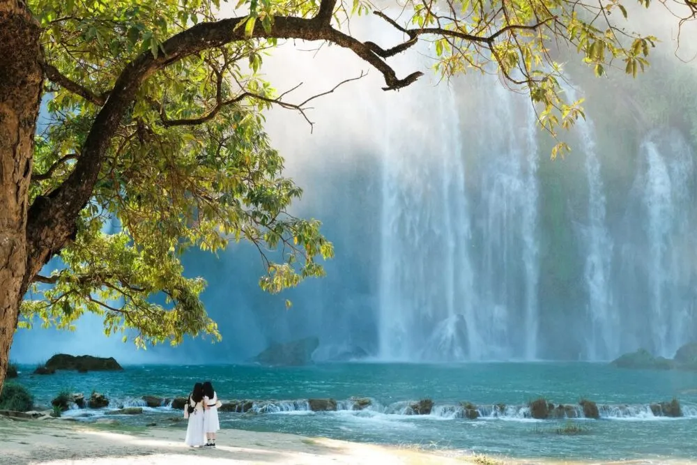 Immagina un velo d’acqua che si riversa impetuosamente da un’altezza di 30 metri, dividendosi in numerosi strati bianchi, avvolgendo le rocce ricoperte di muschio. Non è solo una cascata, ma un magnifico quadro naturale dipinto dalla creazione, situato proprio sul confine tra Vietnam e Cina. Le barche di bambù scivolano dolcemente sulla superficie color giada del lago, portandoti più vicino per sentire la nebbia rinfrescante e ascoltare la sinfonia della foresta. Una sensazione di libertà e sopraffazione che nessuna parola può descrivere completamente.